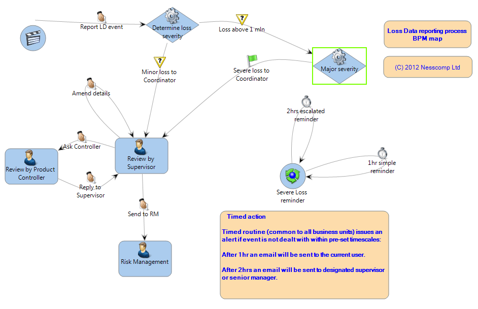 Escalating and alerting features are added using the built-in timed and conditional components of the BPM platform, usually in conjunction with the business rules. These components allow for a changing process if the standard process is not carried out in the normal way. For example reminders can be emailed to the users (or their superiors) who do not react quickly enough to required actions. The whole process flow can even be changed if the event that occurs requires emergency handling.